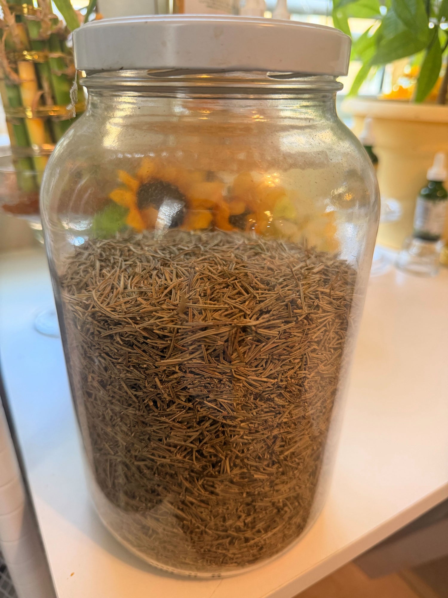 Size: Gallon glass apothecary jar 75% majority filled with dried rosemary leaf